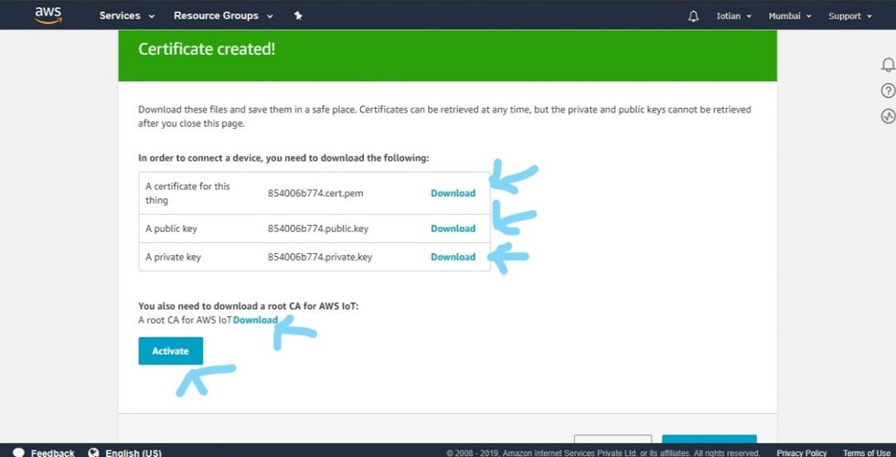 step-4 Now click on Create certificates and download all the certificates and save the root ca-1 file with .pem extension and click on Activate and save all these in a same folder and these are the certificates which you will use in node-red mqtt block.